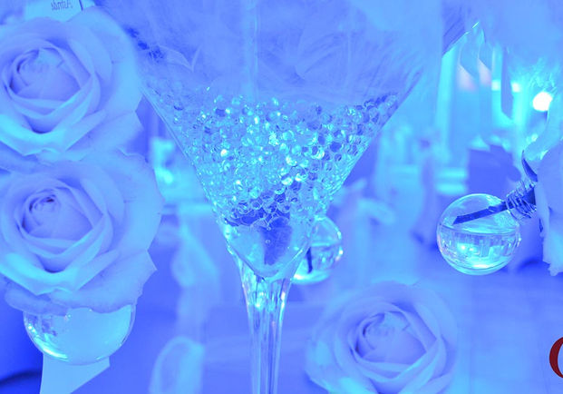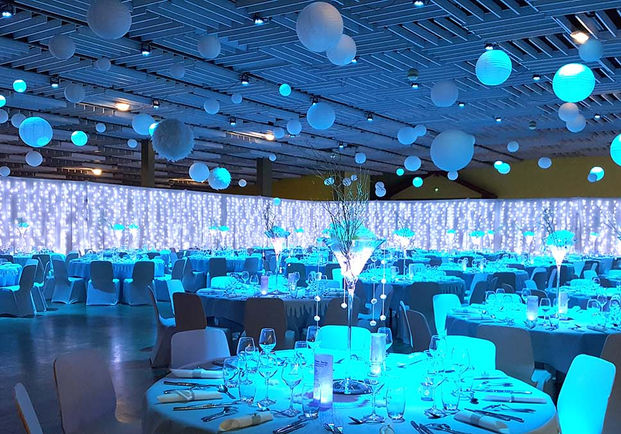 La technique : Le lieu est éclairé de faisceaux de lumière bleue pour un effet hiver glacé garanti. Des rideaux de lumière viendront entourer la salle pour un rendu magique.
